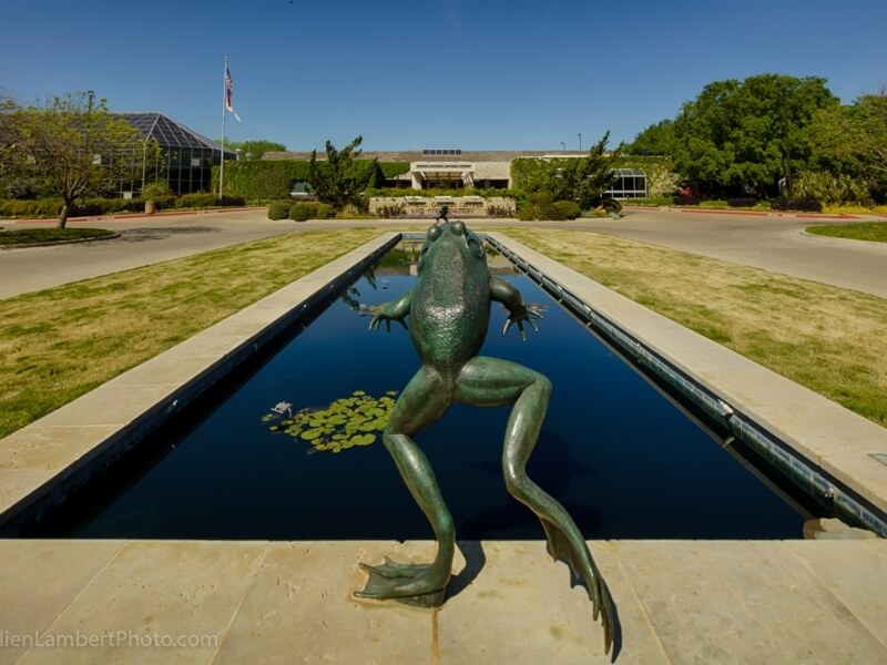 Exit University Drive. Go north on University. Turn left into the main entrance of the BRIT/Fort Worth Botanic Garden campus. (Divided in and out lanes with a center grass median and large flower clock.) Go through the gate. BRIT is on your right. Turn right into the first parking lot.